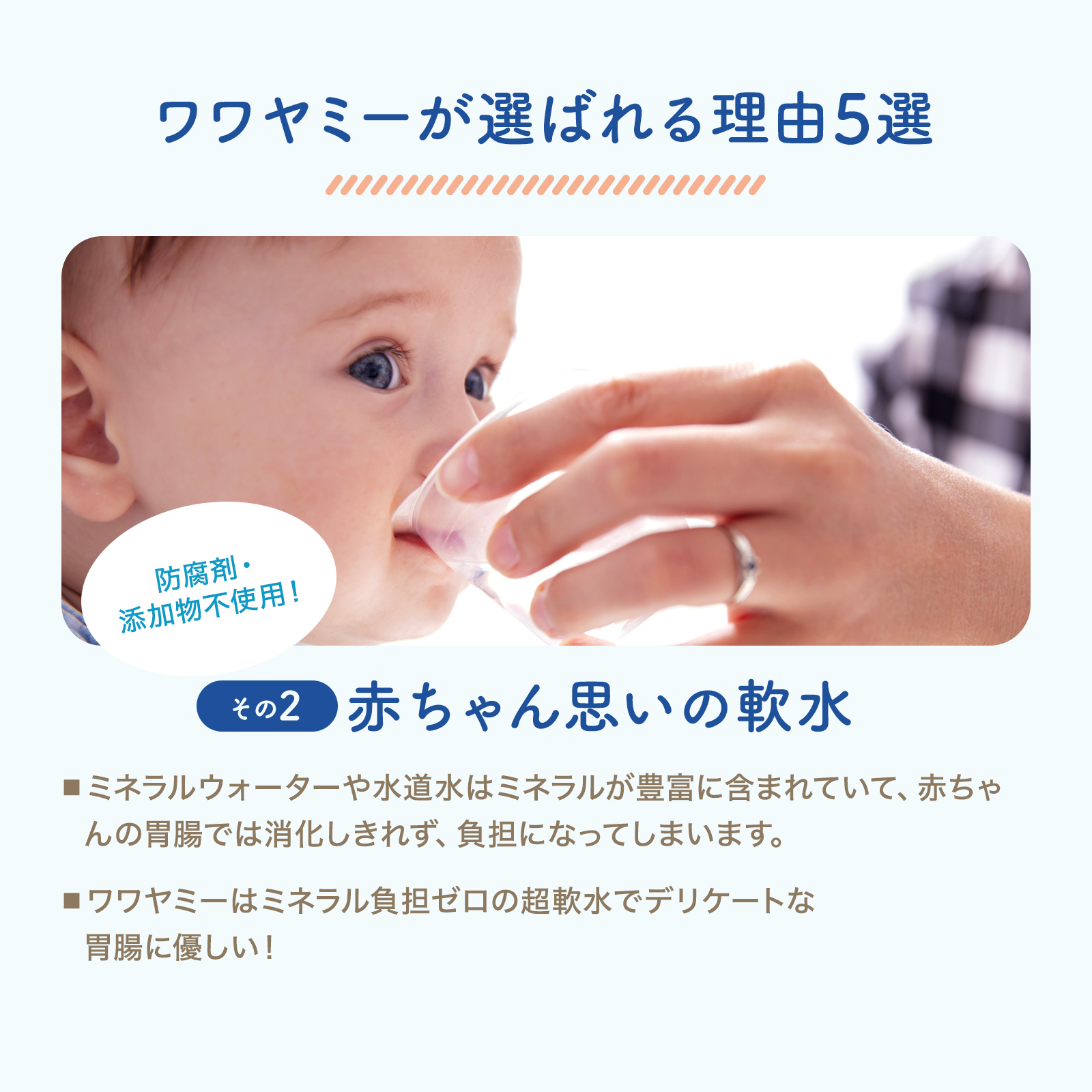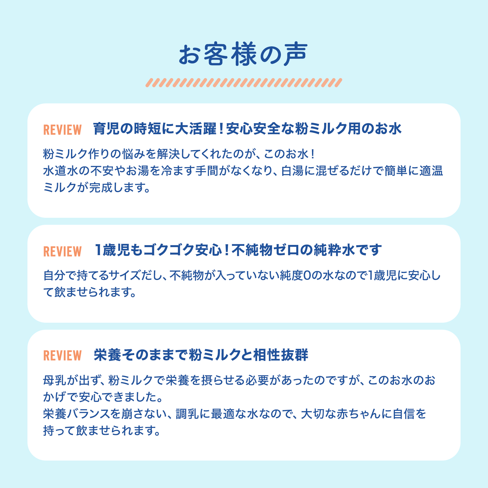 赤ちゃんに不必要なミネラルや不純成分を除去した安心安全な磨かれたお水です。